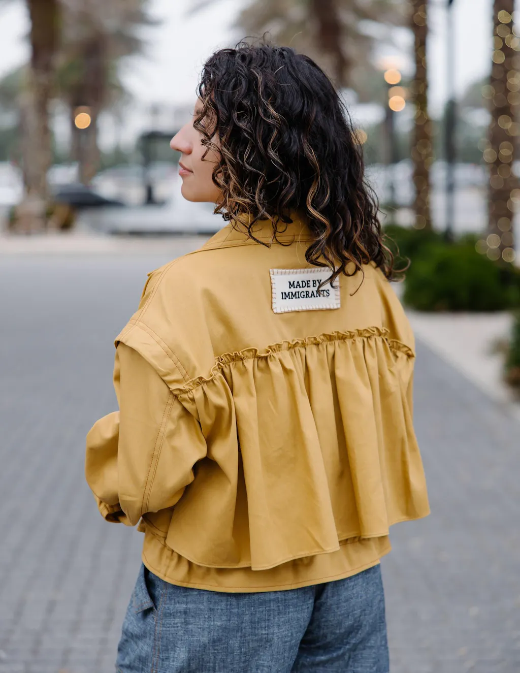 Meet your new statement piece, our Frida jacket. Meticulously crafted from 100% organic cotton twill in a relaxed modern silhouette. Cut in a rich fashion-forward amber tone featuring structured dropped shoulders, signature flap pockets and an adjustable drawstring for a cinched waist look. The back cape adds a feminine touch to this sporty look while the gold-tone hardware elevates it. A unique piece for the woman who demands both luxury and edge.